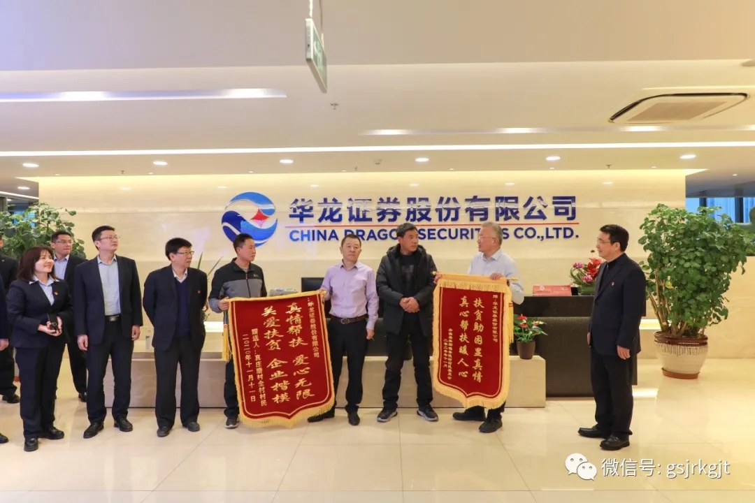 12月1日上午,華龍證券定點(diǎn)幫扶村舟曲縣果耶鎮(zhèn)吾德村黨支部書記黃幫周和真莊磨村黨支部書記韓軍龍一行向公司贈送“扶貧助困顯真情,真心幫扶暖人心”和“真情幫扶、愛心無限,關(guān)愛扶貧,企業(yè)楷?!卞\旗。金控集團(tuán)華龍證券黨委書記、董事長陳牧原,華龍證券黨委副書記、總經(jīng)理蘇金奎代表公司接受錦旗。金控集團(tuán)黨委副書記、總經(jīng)理雷鐵,黨委委員、派駐紀(jì)檢監(jiān)察組組長劉旺興,華龍證券在家班子成員及各部門負(fù)責(zé)人參加了會見。