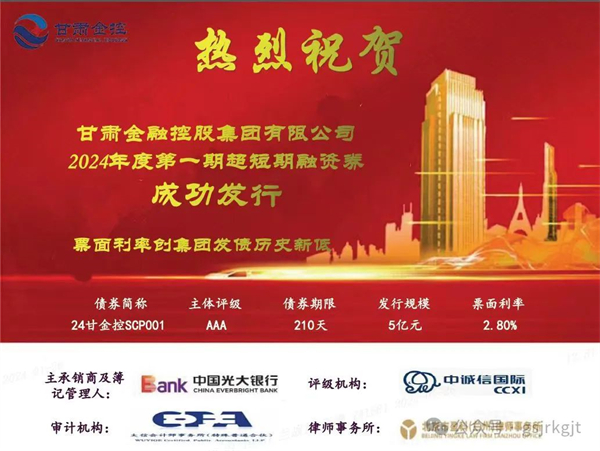 1月26日,甘肅金控集團(tuán)成功發(fā)行2024年度第一期超短期融資券,發(fā)行規(guī)模5億元,債券期限210天,票面利率2.80%,再創(chuàng)發(fā)行債券融資利率新低。