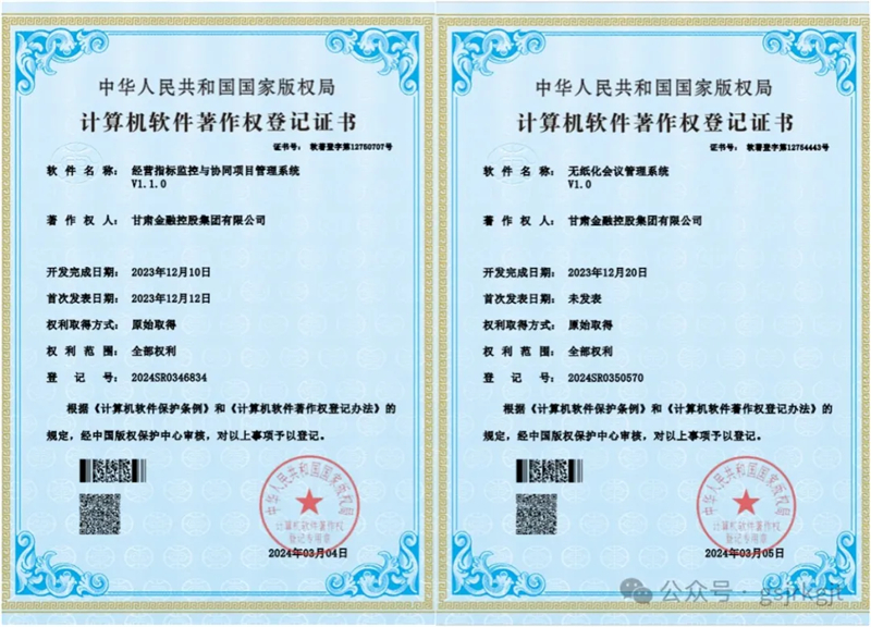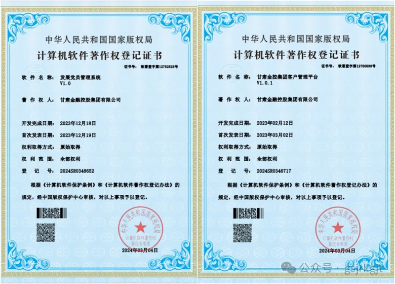 近日,甘肅金控集團獲得“無紙化會議管理系統(tǒng)”、“客戶管理平臺”、“經(jīng)營指標(biāo)監(jiān)控與協(xié)同項目管理系統(tǒng)”和“發(fā)展黨員管理系統(tǒng)”四項計算機軟件著作權(quán)登記證書。本次獲得證書的軟件系統(tǒng)是集團在行政辦公、經(jīng)營管理和黨建信息化建設(shè)方面的最新成果,標(biāo)志著集團信息技術(shù)能力邁上新臺階。