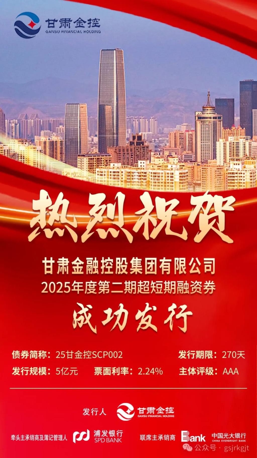 2月24日,甘肅金控集團成功發(fā)行2025年度第二期超短期融資券,規(guī)模5億元,期限270天,票面利率2.24%。甘肅金控集團始終秉持穩(wěn)健經(jīng)營理念,持續(xù)提升核心競爭力,此次債券的成功發(fā)行,充分體現(xiàn)了市場對集團信用資質和發(fā)展前景的信心。