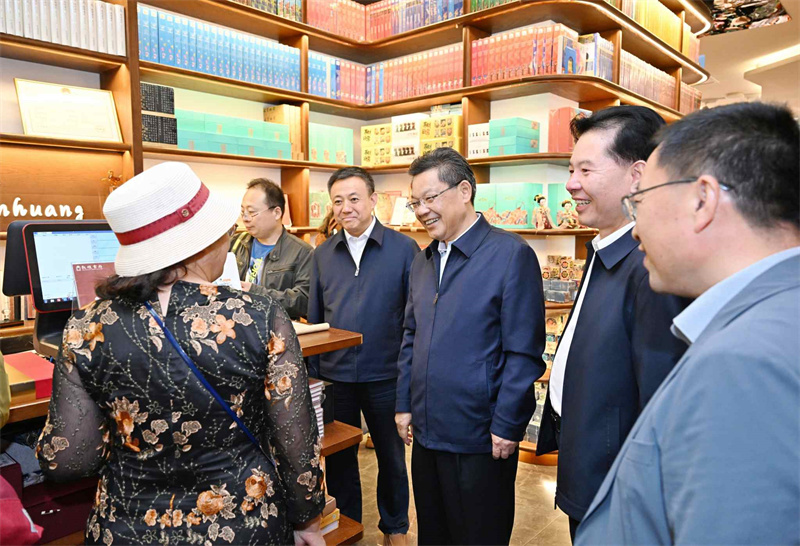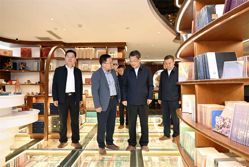 任振鶴先后來到敦煌印局、敦煌無界、敦煌書局和敦煌集·非遺文化街區(qū),詳細(xì)了解文化產(chǎn)業(yè)發(fā)展和非遺文化街區(qū)建設(shè)等情況。他指出,敦煌文化延續(xù)近兩千年,是世界現(xiàn)存規(guī)模最大、延續(xù)時間最長、內(nèi)容最豐富、保存最完整的藝術(shù)寶庫。要不斷擦亮敦煌文化名片,圍繞建設(shè)世界文化遺產(chǎn)保護的典范和敦煌學(xué)研究高地,把握傳承和創(chuàng)新的關(guān)系,找準(zhǔn)契合處、聯(lián)結(jié)點,加快業(yè)態(tài)融合、產(chǎn)品融合、市場融合、服務(wù)融合,在更高起點、更高層次、更高目標(biāo)上讓敦煌文化“活起來”“潮起來”,為現(xiàn)代化建設(shè)提供有力文化支撐。