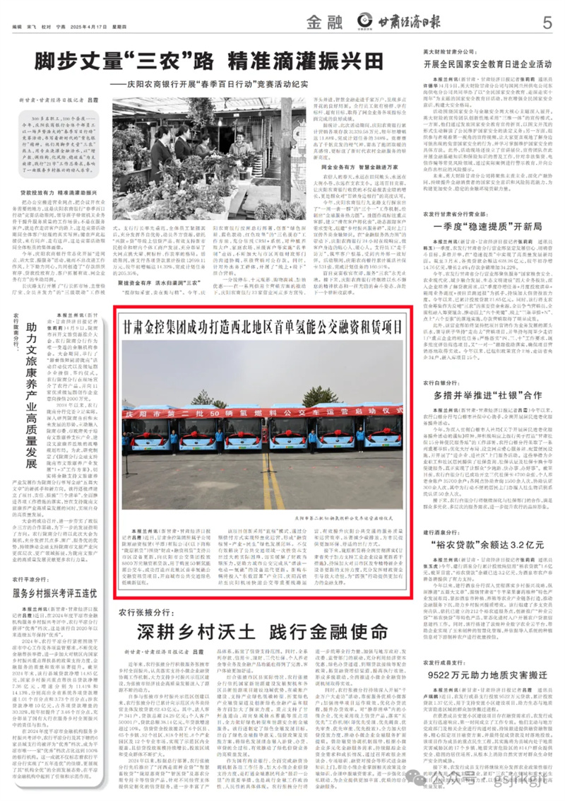 本報蘭州訊(新甘肅·甘肅經(jīng)濟(jì)日報記者 呂霞)近日,甘肅金控集團(tuán)所屬子公司隴原融資租賃(平潭)有限公司(以下簡稱“隴原租賃”)圍繞“財政+融資租賃”支持縣市區(qū)設(shè)備更新,向慶陽市公交集團(tuán)投放8800萬元融資租賃款,用于購置50輛氫能源公交車,成功打造西北地區(qū)首單氫能公交融資租賃項(xiàng)目,開啟城市公共交通綠色低碳新征程。