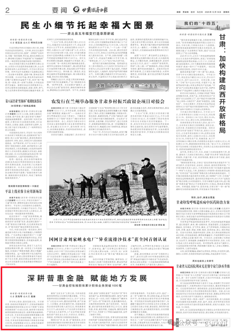(新甘肅·甘肅經(jīng)濟日報記者 蘇海琴 通訊員 高婧)堅守初心使命,服務(wù)發(fā)展大局。在甘肅省委、省政府的堅強領(lǐng)導(dǎo)下,甘肅金控集團(tuán)所屬金控張掖融資擔(dān)保有限公司(以下簡稱“甘肅金控張掖擔(dān)?!保┳猿闪⒁詠?,始終堅守政府性融資擔(dān)保機構(gòu)功能定位,深耕普惠金融領(lǐng)域,以多元化、專業(yè)化的金融服務(wù)精準(zhǔn)緩解小微企業(yè)、“三農(nóng)”等主體融資難題。截至今年11月底,甘肅金控張掖擔(dān)保累計擔(dān)保業(yè)務(wù)突破1000筆,擔(dān)保規(guī)模超46億元,持續(xù)為張掖市域經(jīng)濟高質(zhì)量發(fā)展注入強勁金融動能。
