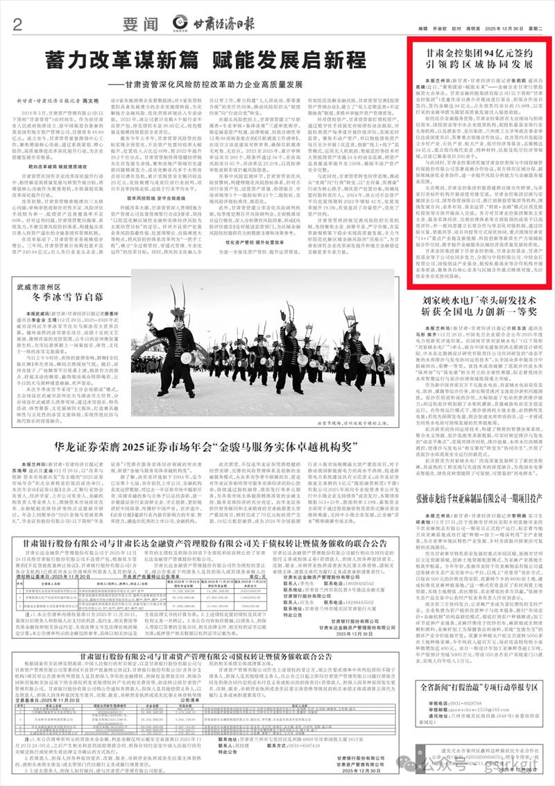 與此同時,甘肅金控集團(tuán)所屬甘肅金控?fù)?dān)保與中國投融資擔(dān)保股份有限公司簽署戰(zhàn)略合作協(xié)議,雙方將在區(qū)域分保、聯(lián)保領(lǐng)域深化業(yè)務(wù)協(xié)作,進(jìn)一步提升風(fēng)險分擔(dān)能力與金融服務(wù)覆蓋范圍。