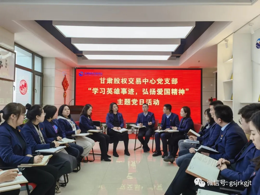 近日,甘肅股權(quán)交易中心黨支部開展“學(xué)習(xí)英雄事跡,弘揚(yáng)愛國精神”主題黨日活動(dòng)。學(xué)習(xí)戍邊衛(wèi)國英雄先進(jìn)事跡,弘揚(yáng)偉大愛國主義和革命英雄主義精神。