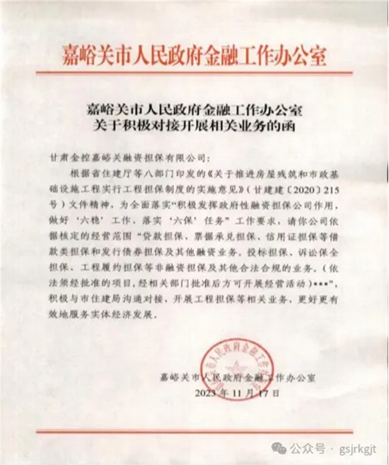 金控嘉峪關(guān)擔(dān)保公司通過(guò)開展履約保函等工程擔(dān)保業(yè)務(wù),在助力強(qiáng)化建筑領(lǐng)域風(fēng)險(xiǎn)管理和建立健全建筑市場(chǎng)誠(chéng)信機(jī)制中充分發(fā)揮政府性融資擔(dān)保機(jī)構(gòu)職能,為更好服務(wù)地方實(shí)體經(jīng)濟(jì)發(fā)展努力貢獻(xiàn)自身力量。