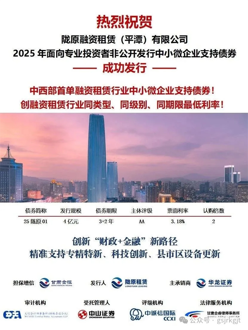 隴原租賃充分依托甘肅金控集團(tuán)“財(cái)政+金融”模式優(yōu)勢(shì),以財(cái)政政策引導(dǎo)、金融服務(wù)協(xié)同、投融資聯(lián)動(dòng)等方式,吸引資本市場(chǎng)資金全力支持我省實(shí)體經(jīng)濟(jì)。7月28日,隴原租賃在上交所成功發(fā)行中小微企業(yè)支持債券,規(guī)模4億元,期限3+2年,票面利率3.18%,認(rèn)購(gòu)倍數(shù)2倍,是中西部省份首單融資租賃行業(yè)中小微企業(yè)支持債券,創(chuàng)融資租賃行業(yè)同類(lèi)型、同級(jí)別、同期限歷史最低利率。